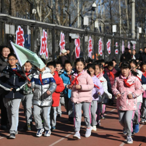 2月17日,在北京市海淀区中关村第二小学(华清校区),学生参与“阳光跑”活动。