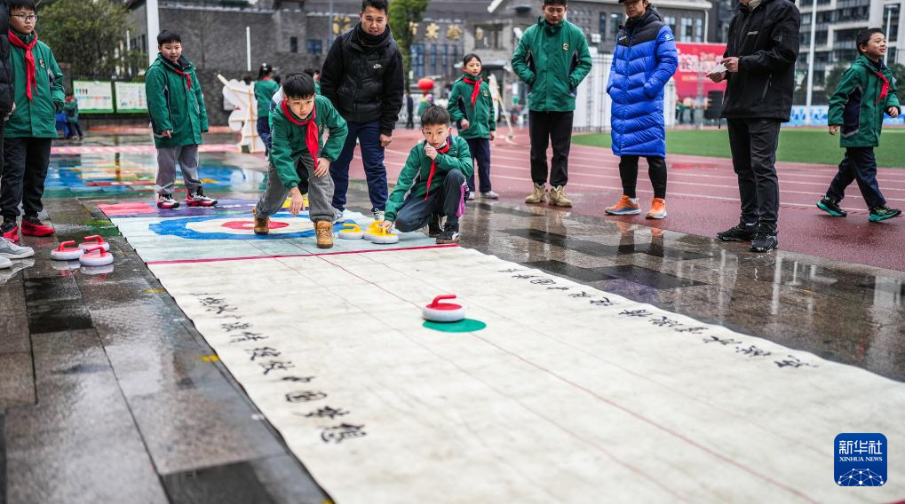 2月17日,贵阳市实验小学未来方舟分校的学生在体验旱地冰壶。