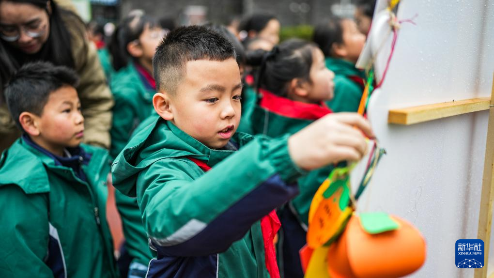 2月17日,贵阳市实验小学未来方舟分校的学生在将心愿卡挂上心愿墙。