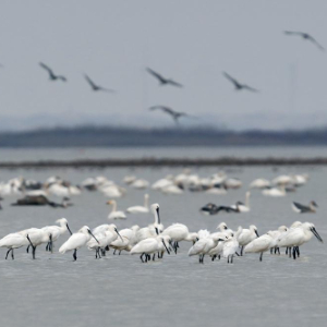 白琵鹭等候鸟在江西省南昌市新建区昌邑乡附近水域休憩(2月18日摄)。