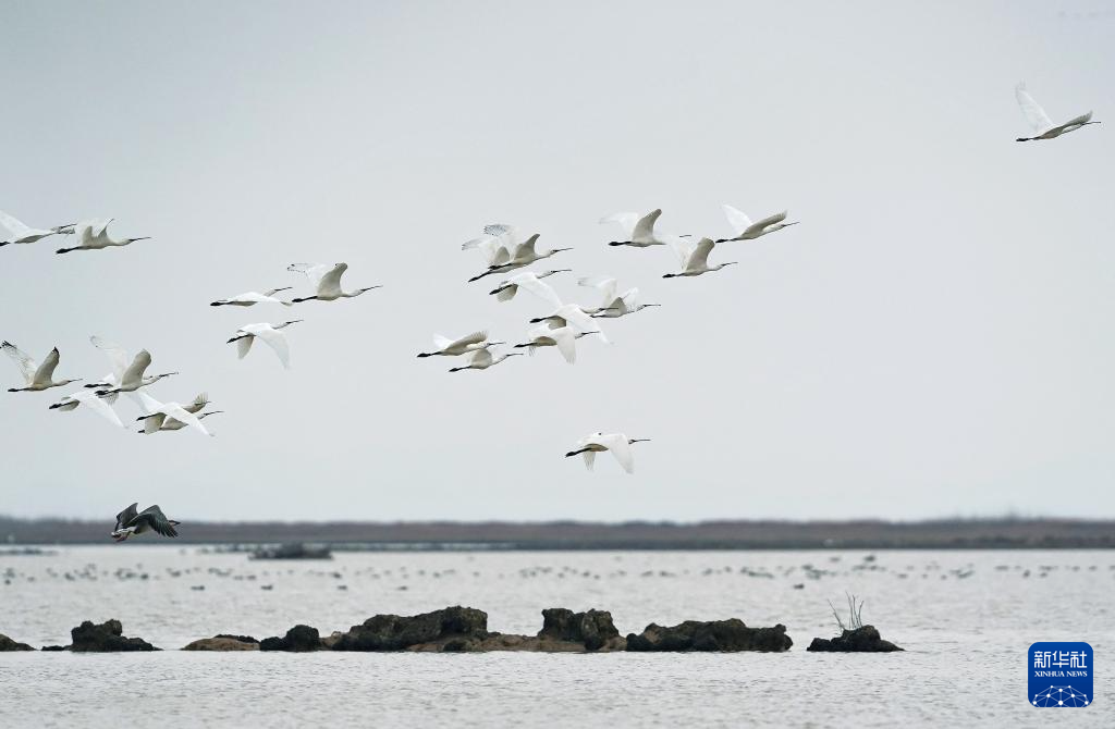 白琵鹭等候鸟在江西省南昌市新建区昌邑乡附近水域飞翔(2月18日摄)。