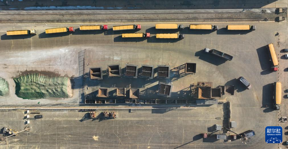 2月18日,在营口港鲅鱼圈港区,运输玉米的敞顶箱车辆在码头等待(无人机照片)。