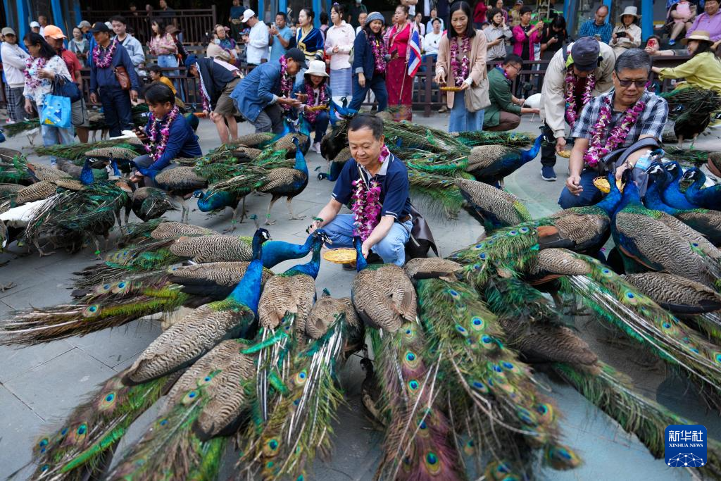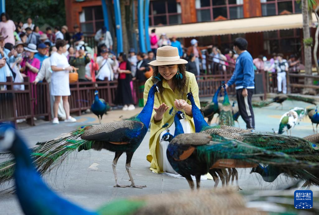 2月19日,游客在西双版纳一景区与孔雀互动。