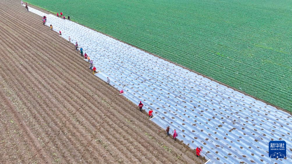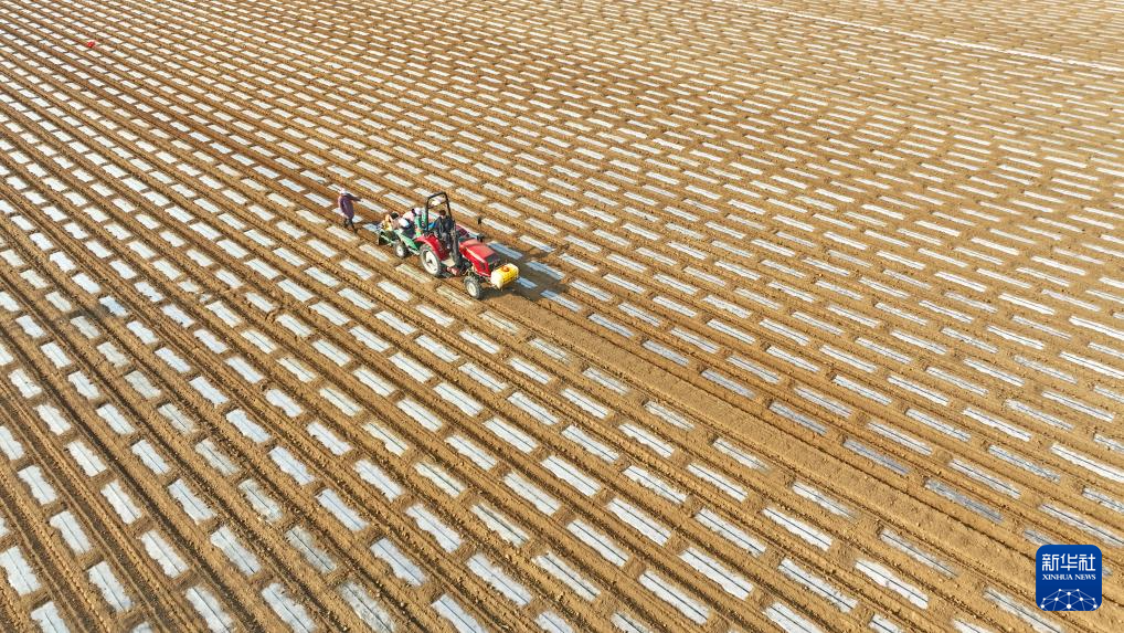 2月18日,在山东省临沂市郯城县郯城街道一处蔬菜种植基地,农民使用农机播种“订单土豆”(无人机照片)。