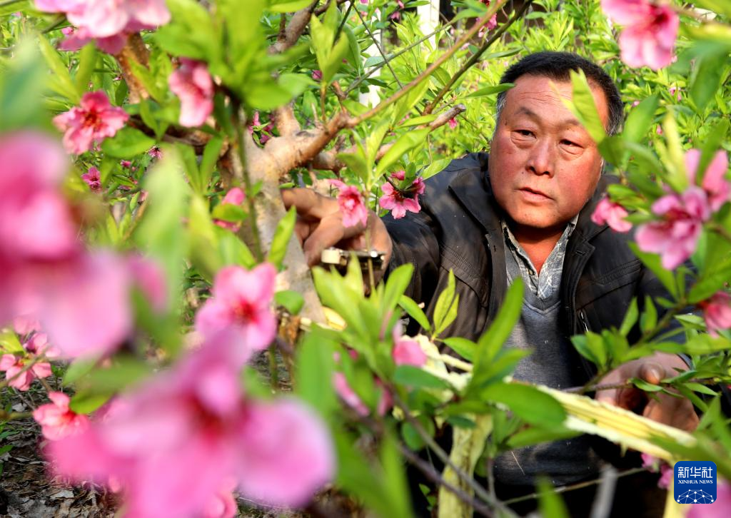 2月18日,在河北省沧州市吴桥县于集镇孙庄村,农民在给油蟠桃树剪枝。
