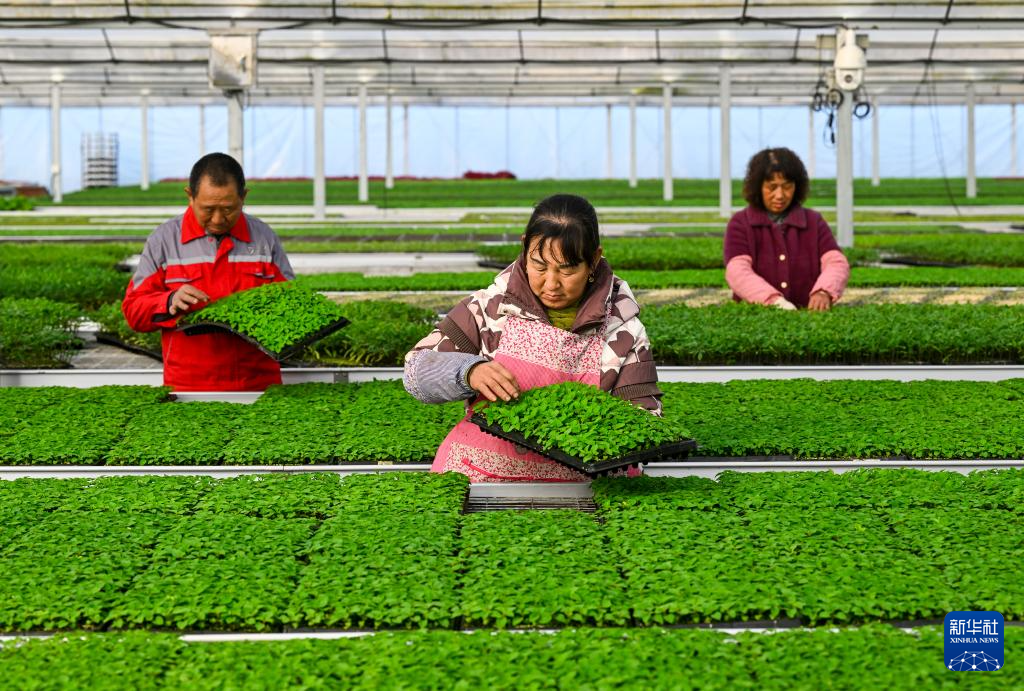 2月18日,在浙江省宁波市镇海区九龙湖镇种苗培育基地,工作人员在管护菜苗。