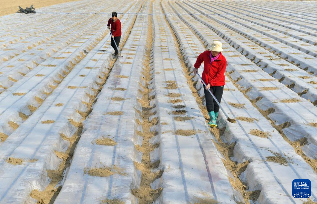 2月18日,在河南省商丘市夏邑县李集镇李中村红高粱家庭农场,村民为田间铺设的地膜覆土加固。