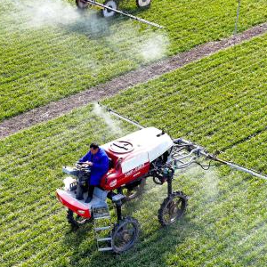 2月18日,在安徽省亳州市谯城区赵桥乡一处麦田,农民驾驶农机开展田间管理(无人机照片)。