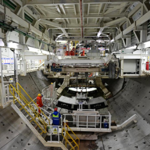 2月19日,青岛胶州湾第二隧道工程南线主隧道盾构段,中铁十四局建设者在进行箱涵拼装作业。