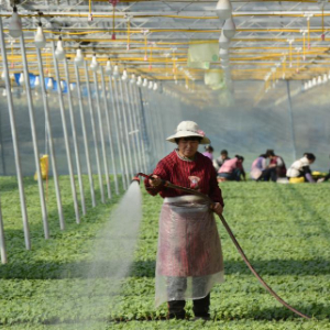 2月19日,农民在大兴区庞各庄镇一育苗大棚内工作。