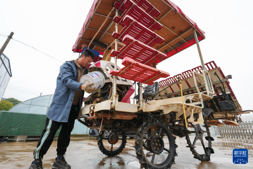 2月20日,在湖南省浏阳市龙伏镇的鼎钧种养专业合作联合社,工作人员在给插秧机添加防冻冷却液。