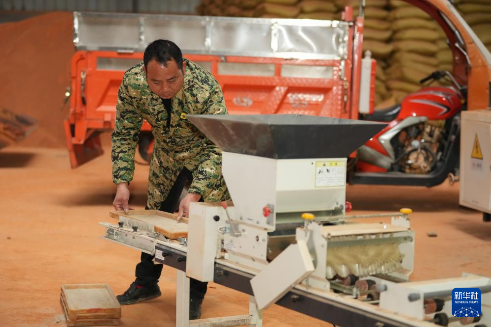 2月20日,在湖南省浏阳市龙伏镇的瑞康农机专业合作社,工作人员在智慧育秧大棚清点用于育秧的基质原料。