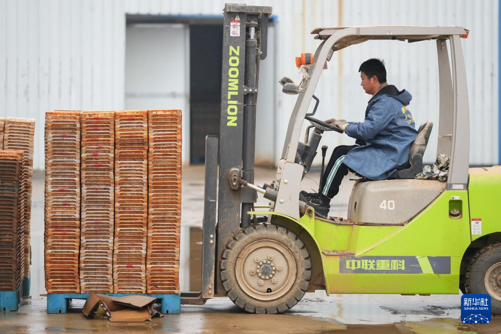 2月20日,在湖南省浏阳市龙伏镇的鼎钧种养专业合作联合社,工作人员使用叉车搬运秧盘。