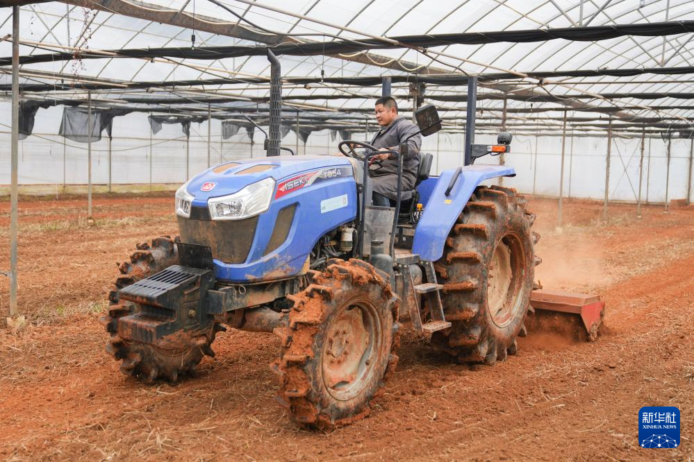2月20日,在湖南省浏阳市龙伏镇的瑞康农机专业合作社,工作人员在智慧育秧大棚驾驶旋耕机平整土地。