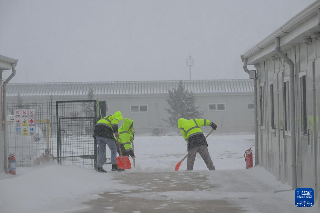 2月13日,在土耳其阿克萨拉伊省的图兹湖地下天然气储库扩建项目现场,员工在项目地住宿区清理积雪。