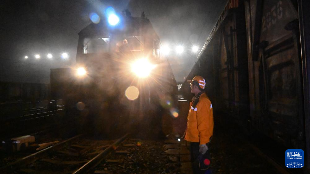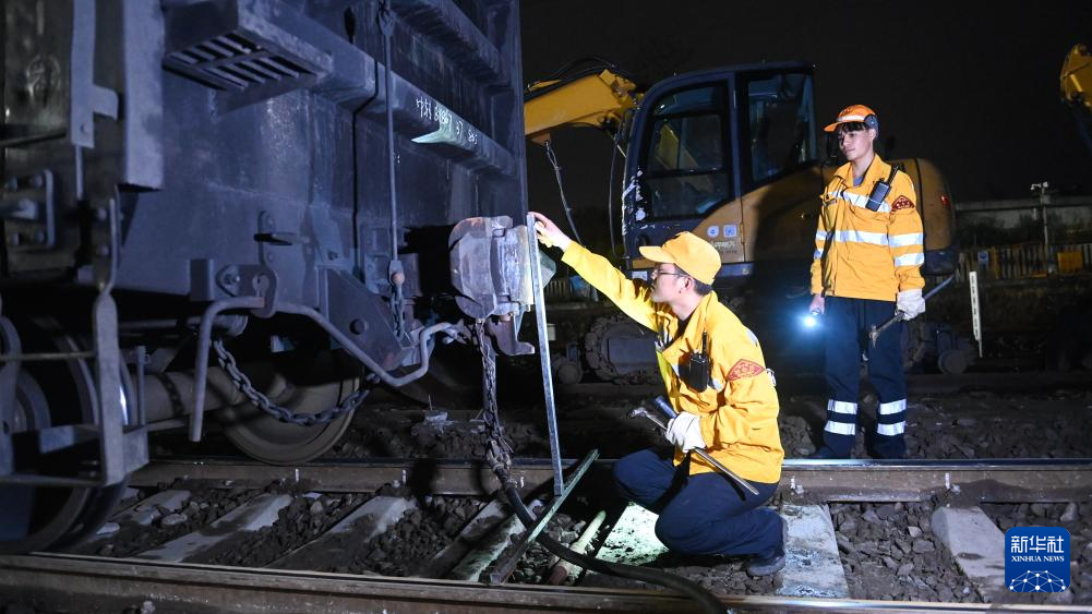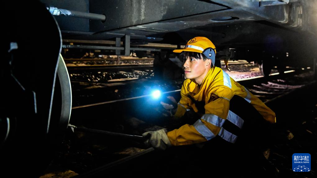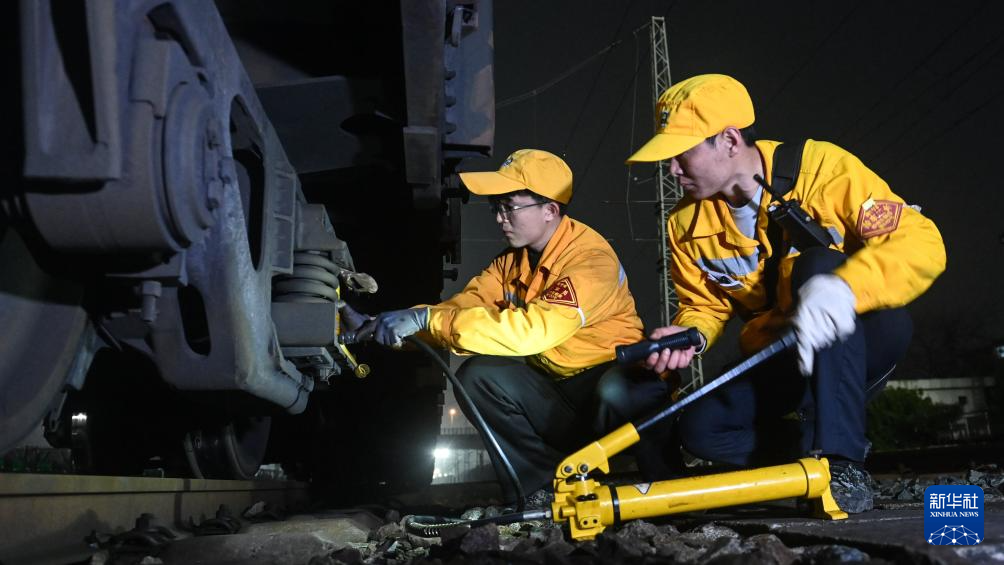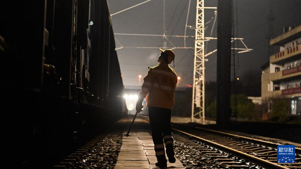 2月19日,在柳州南编组站,工人们进行夜间检测作业。