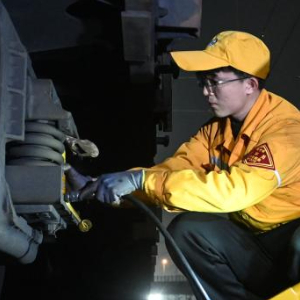 2月19日,在柳州南编组站,检车员在检查车轮。