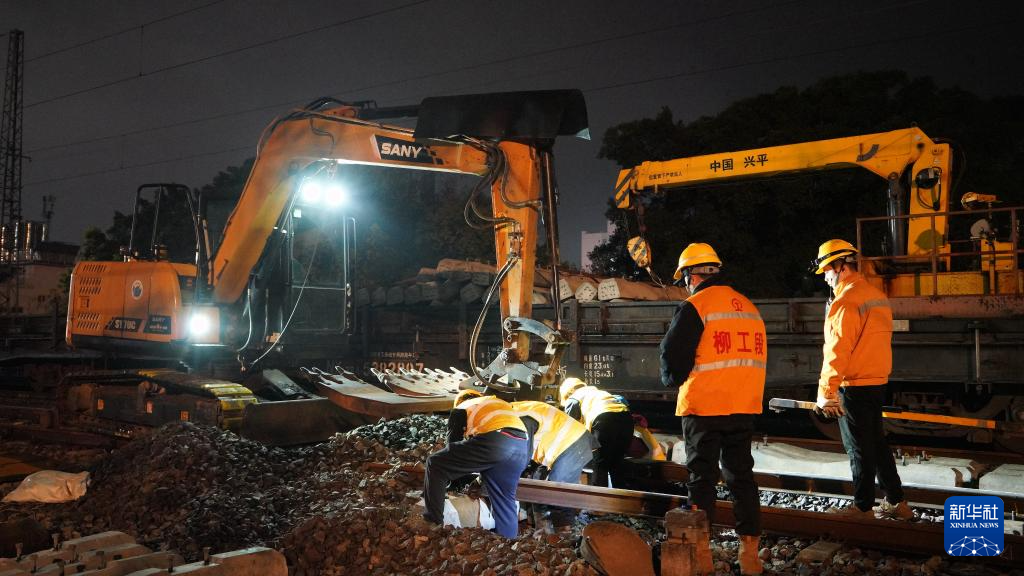 2月20日,在湘桂线柳州南站一场,铁路工人利用勾机对轨枕进行更换作业。