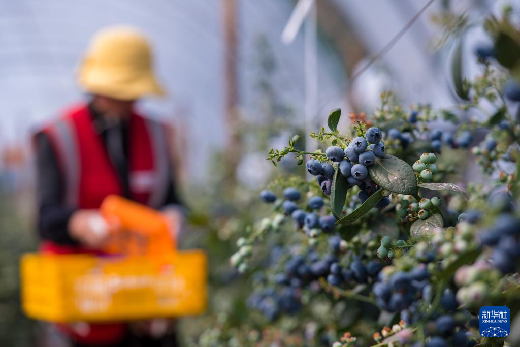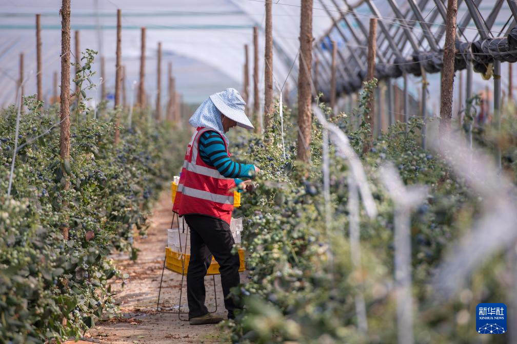2月19日,工人在位于砚山县维摩乡的蓝莓种植基地采摘蓝莓。