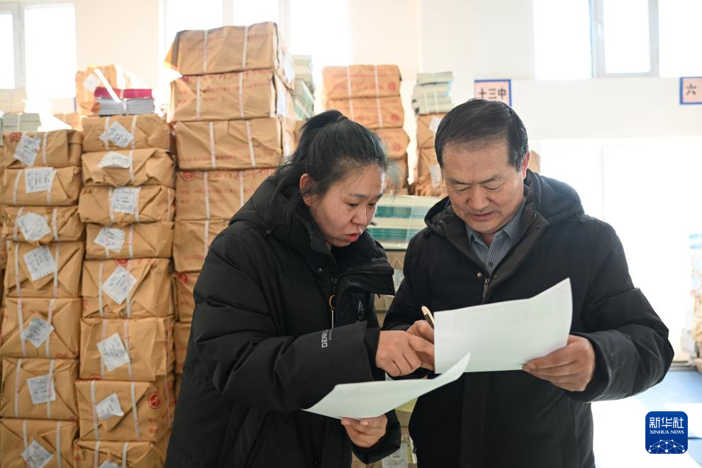 2月21日,在位于内蒙古兴安盟乌兰浩特市的新华书店库房,工作人员(左)协助乌兰浩特市第十二中学校长核对教材清单。
