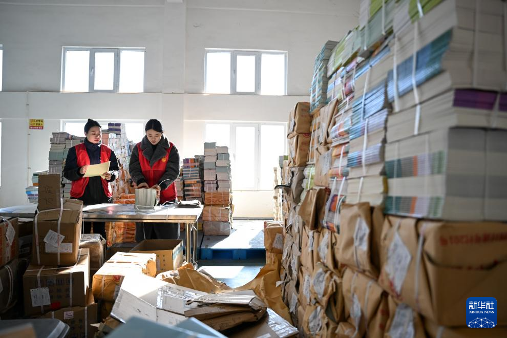 2月21日,工作人员在内蒙古兴安盟乌兰浩特市的新华书店库房内清点教材。
