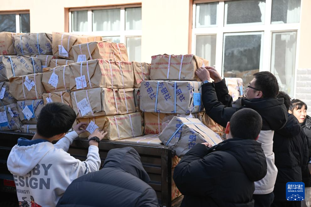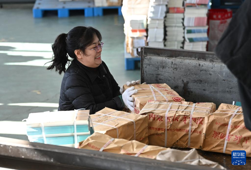 2月21日,工作人员在内蒙古兴安盟乌兰浩特市新华书店库房内将教材装车。