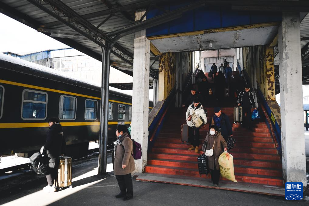 几名旅客在通化站为纪念“最后一次春运”所设立的“打卡点”拍照留念(2月19日摄)。