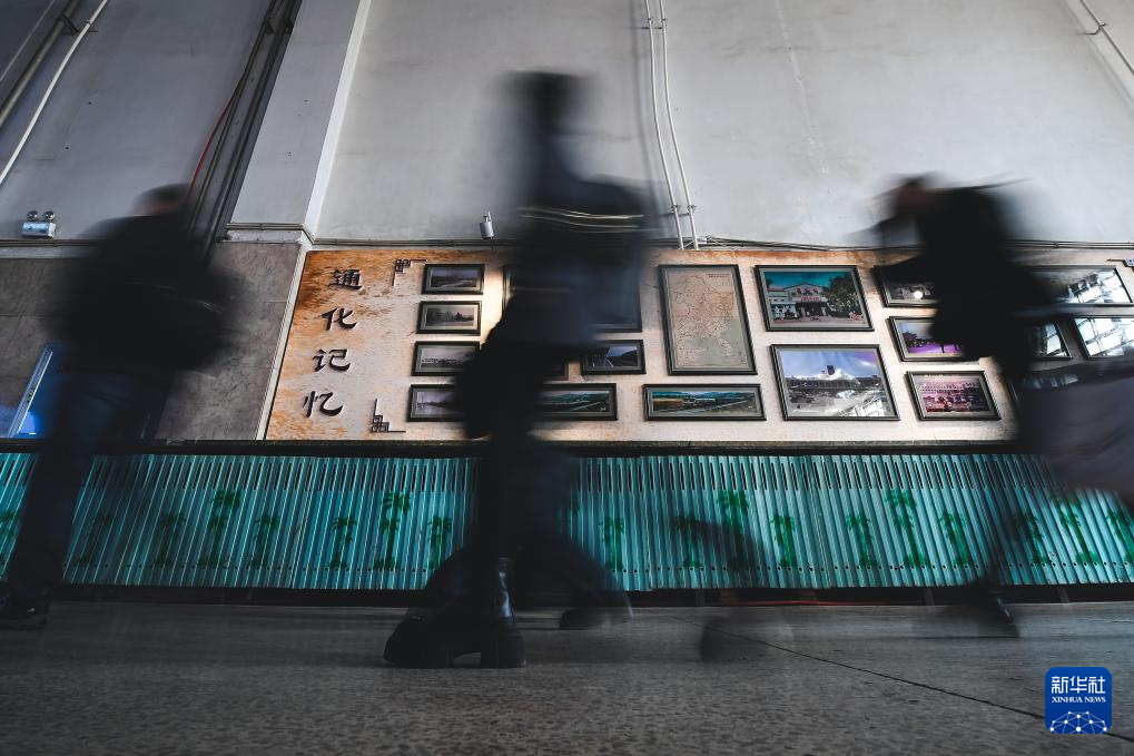 旅客脚步匆匆经过通化站展出的“通化记忆”照片墙(2月19日摄)。