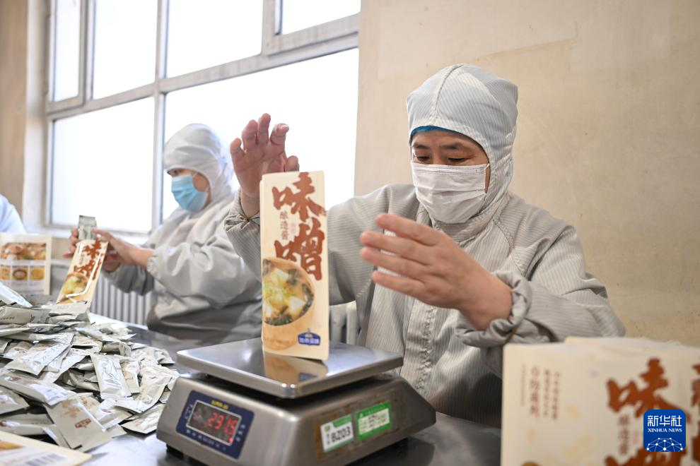 2月20日,工人在内蒙古兴安盟乌兰浩特市内蒙古科沁万佳食品有限公司味噌车间给产品称重。