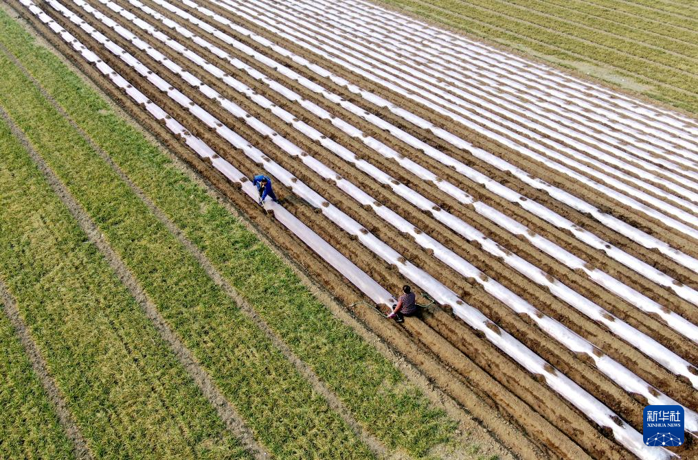 2月21日,山东省临沂市平邑县平邑街道农民在田间为种植的马铃薯覆盖地膜(无人机照片)。
