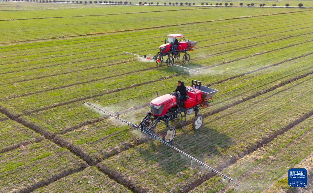 2月20日,在江苏省南通市通州区十总镇育民村高标准农田,农民驾驶植保机械对进入返青期的小麦开展病虫害防治作业(无人机照片)。