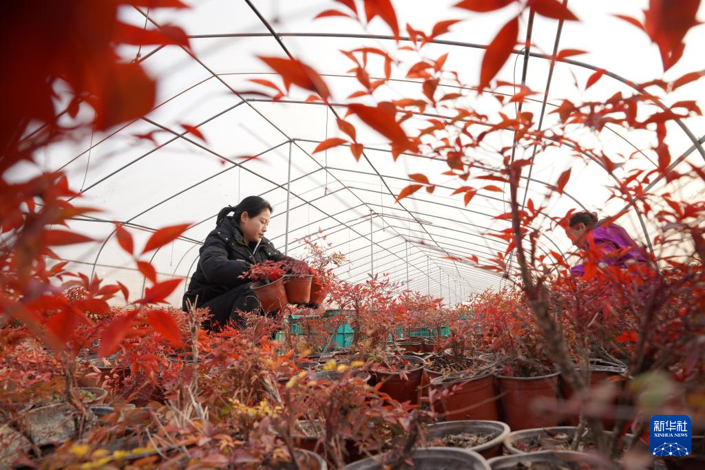 2月20日,河北省邢台市内丘县一家农业科技股份有限公司员工在大棚里管护南天竹。