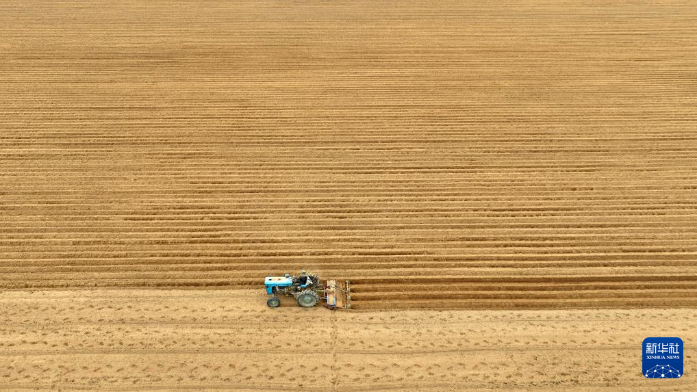 2月21日,在贵州省威宁县雪山镇银光村,毕节市农投机械服务有限公司的农机手驾驶农机帮助村民翻地(无人机照片)。