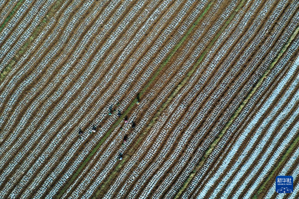 2月21日,农民在贵州省威宁县小海镇营丰村移栽菜苗(无人机照片)。