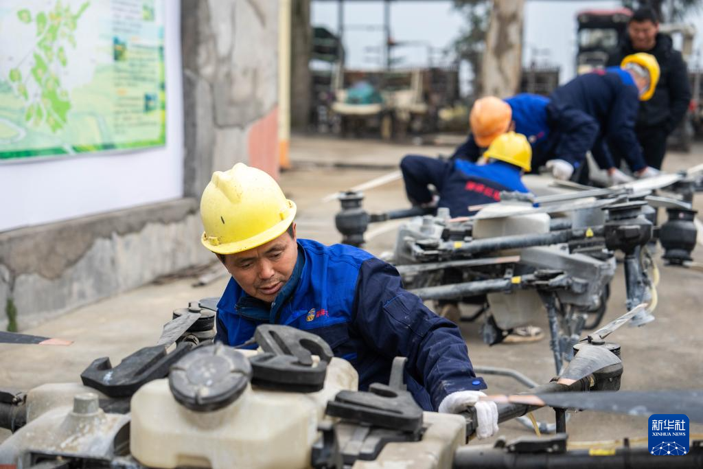2月21日,在长沙市望城区桥驿镇一家农机专业合作社,农机技术人员在检修农用无人机。