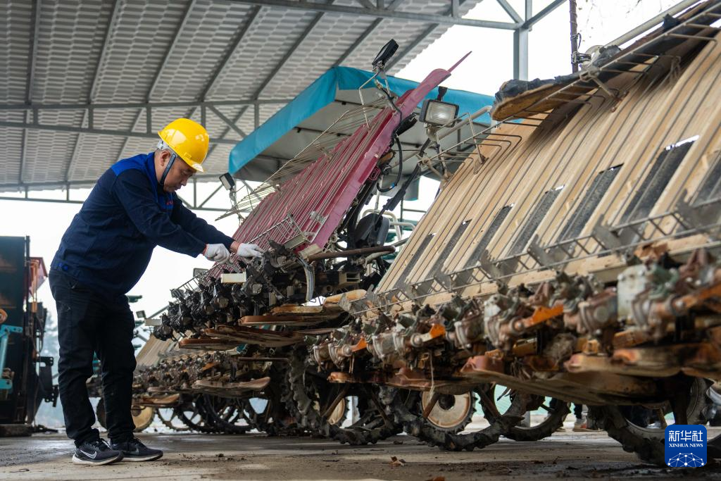 2月21日,在长沙市望城区桥驿镇一家农机专业合作社,农机技术人员在检修插秧机。