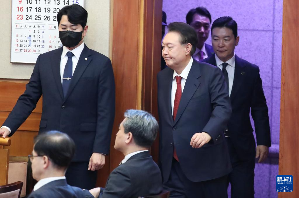2月20日,尹锡悦(中)在韩国首尔宪法法院出席总统弹劾案庭审。
