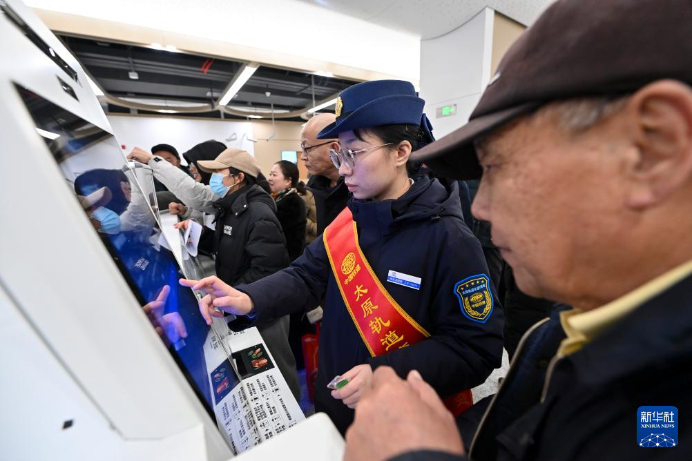 2月22日,在太原轨道交通1号线许坦东街站,工作人员帮助一名老年乘客购票。