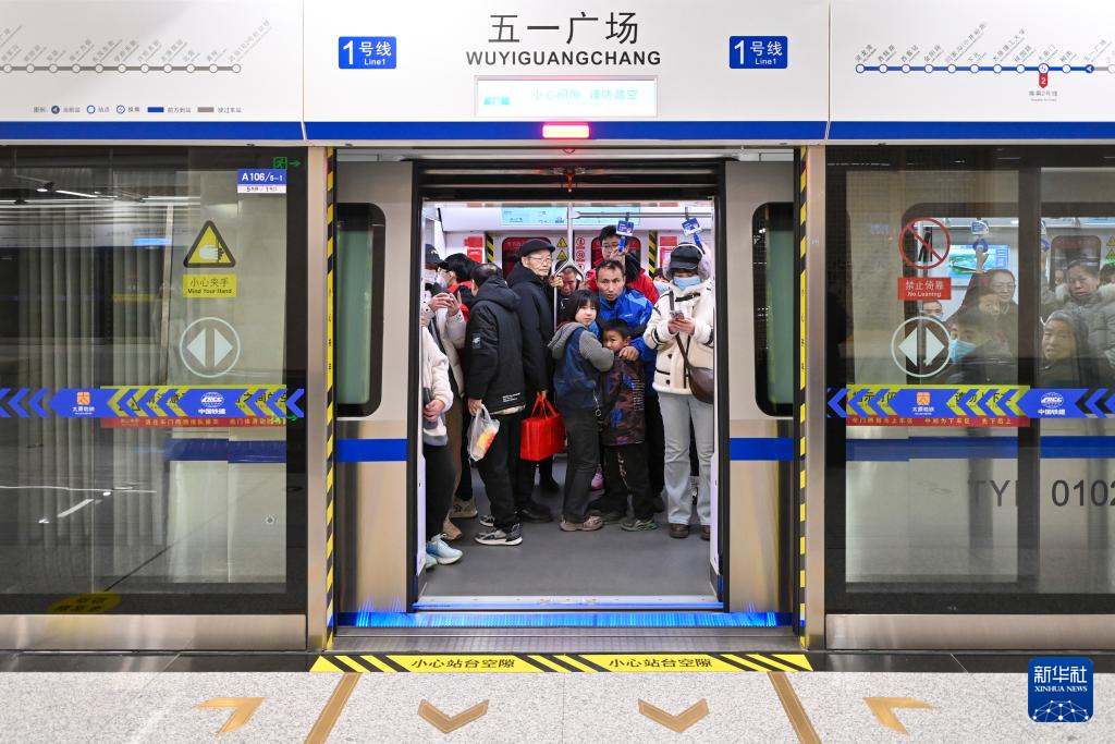 2月22日,乘客在太原轨道交通1号线列车上。