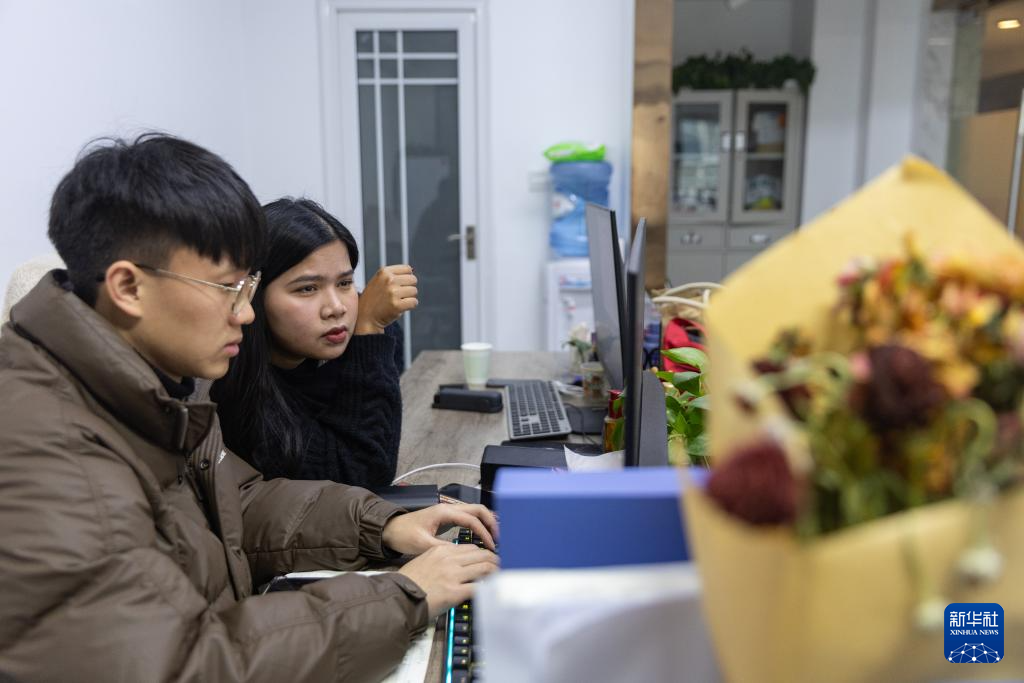2月20日,在重庆市两江新区的工作室内,泰国博主李佩英(右)和摄影师曾豪杰商量拍摄思路。