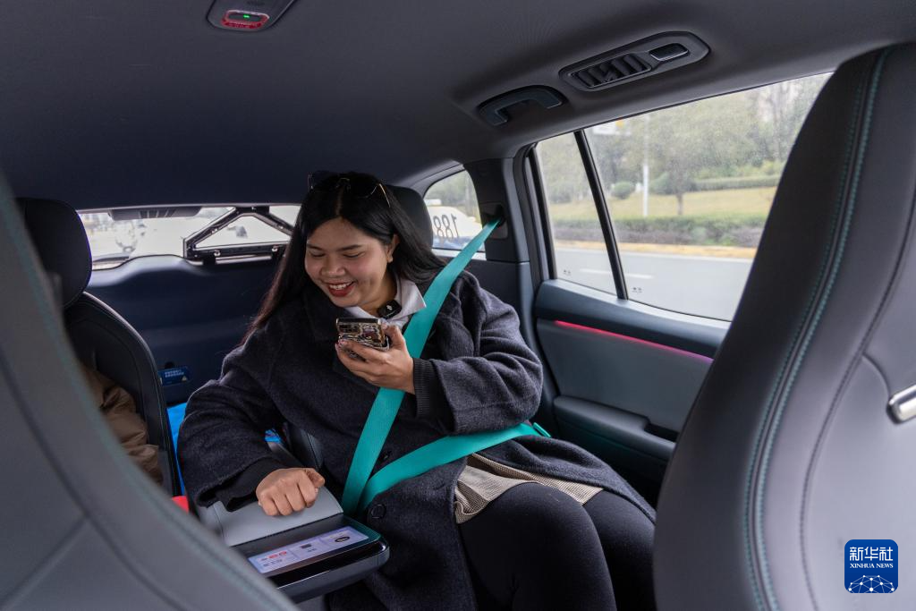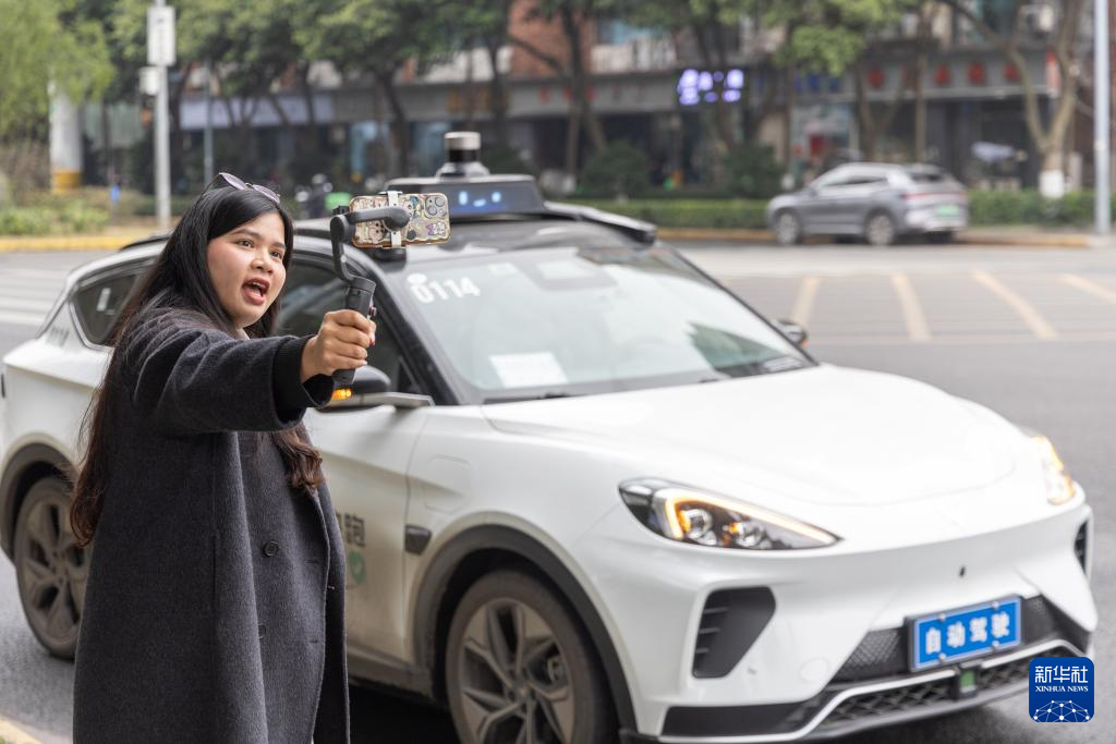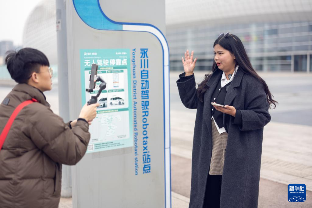 2月21日,在重庆市永川区,泰国博主李佩英拍摄体验无人驾驶网约车。
