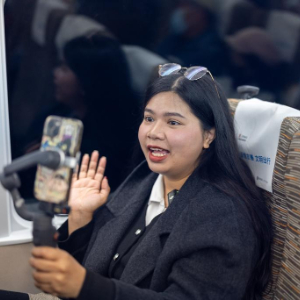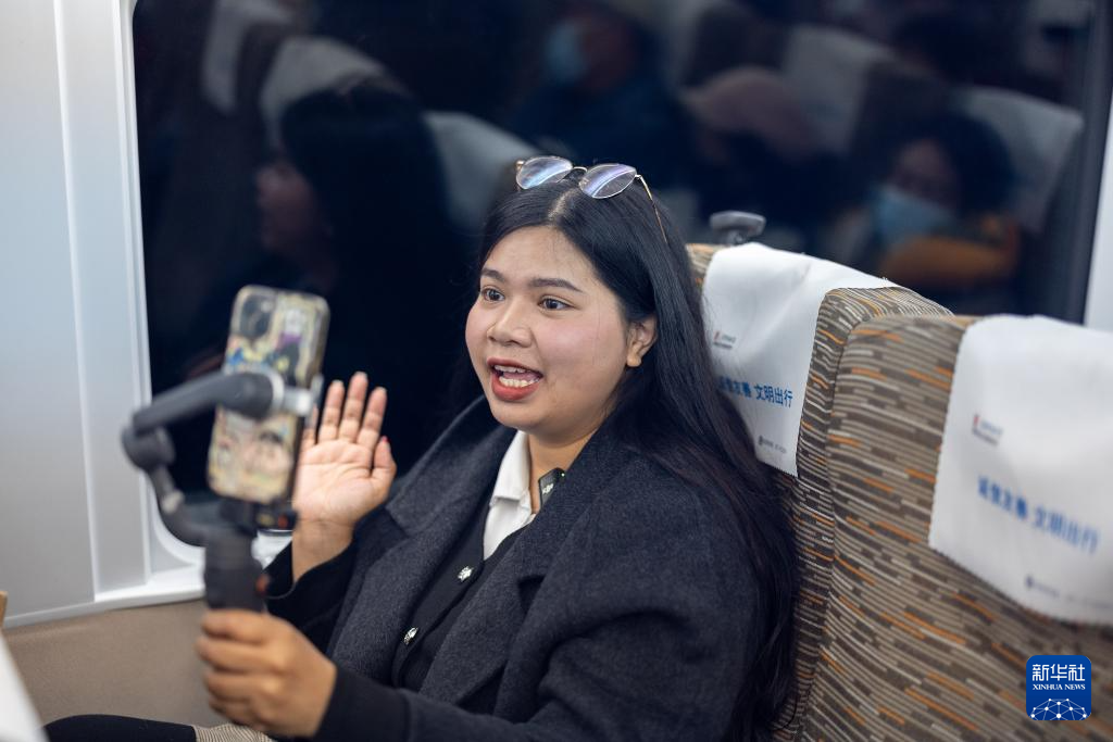 2月21日,泰国博主李佩英在拍摄体验复兴号高铁列车。