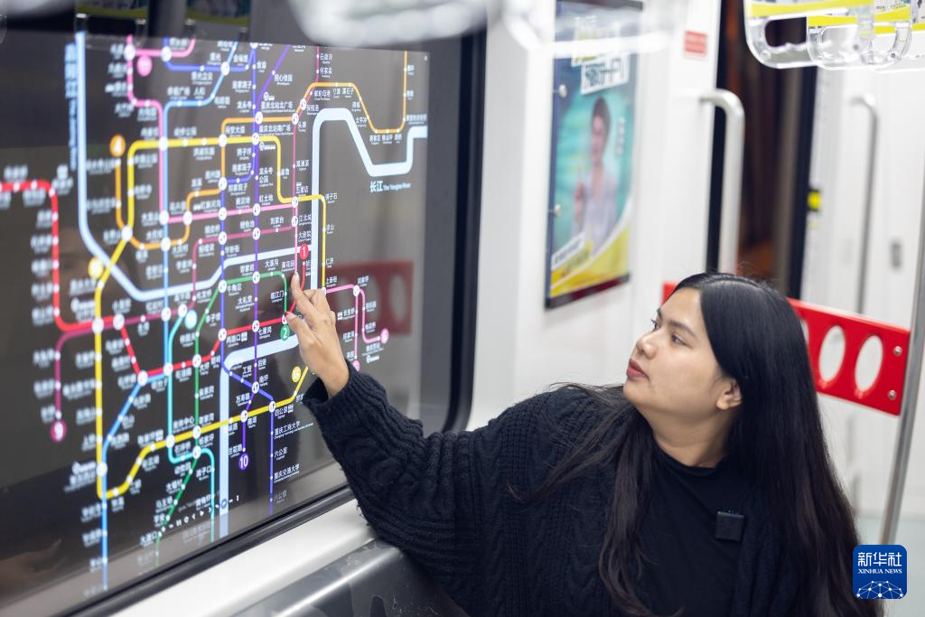 2月20日,泰国博主李佩英在重庆轨道交通1号线上拍摄体验智能车窗。