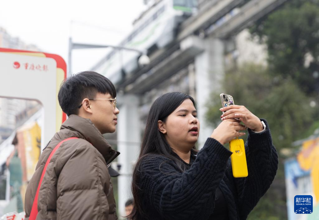 2月20日,在重庆市渝中区李子坝观景平台,泰国博主李佩英(右)和摄影师曾豪杰在直播。