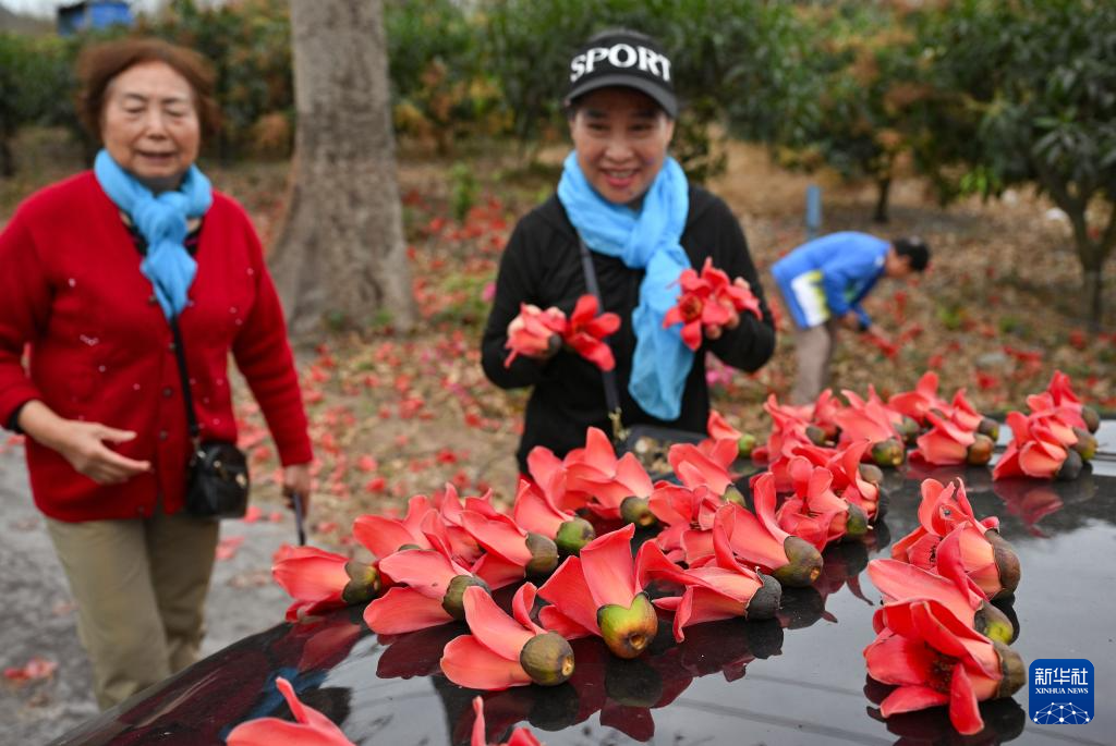 2月22日,游客在海南昌江收集掉落在树下的木棉花。