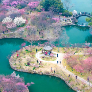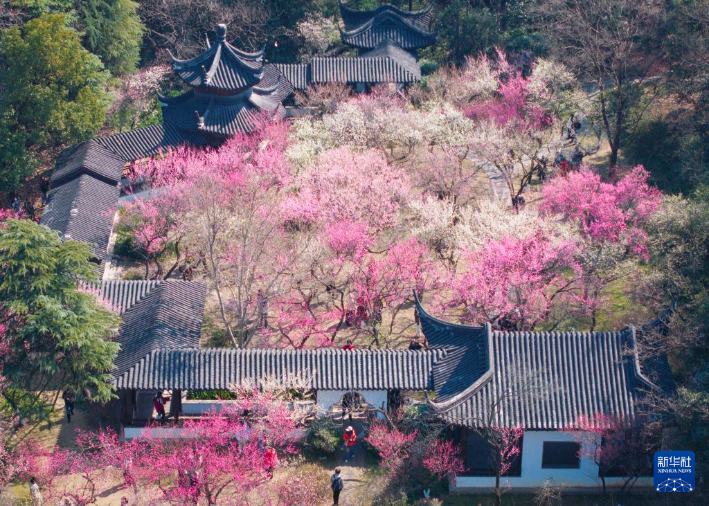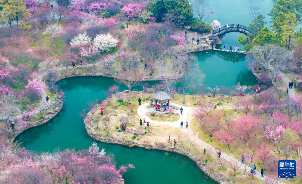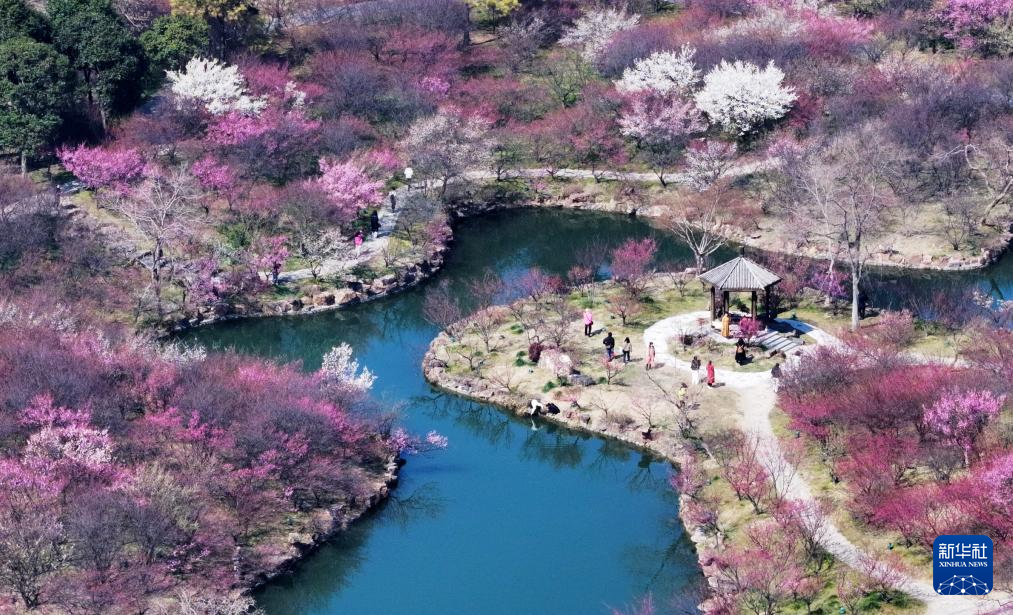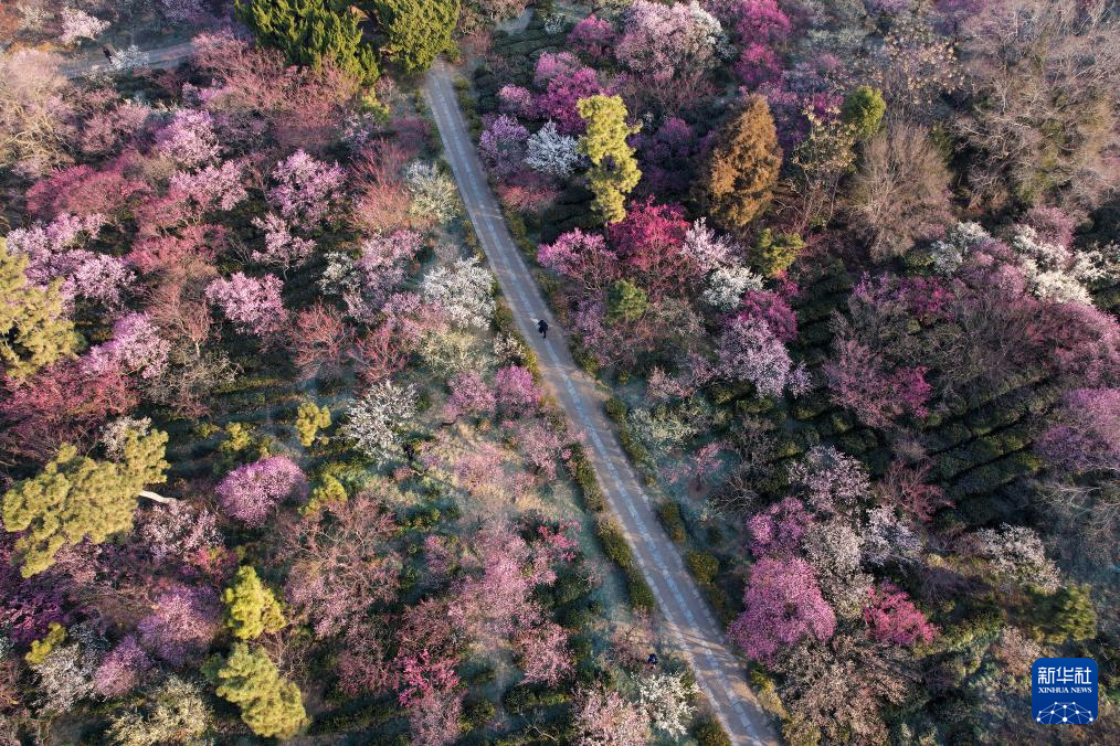 2月24日,游客在南京雨花台风景区赏花游玩(无人机照片)。