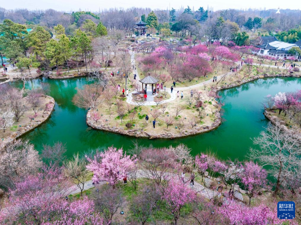 2月24日,游客在江苏扬州瘦西湖风景区赏梅游玩(无人机照片)。