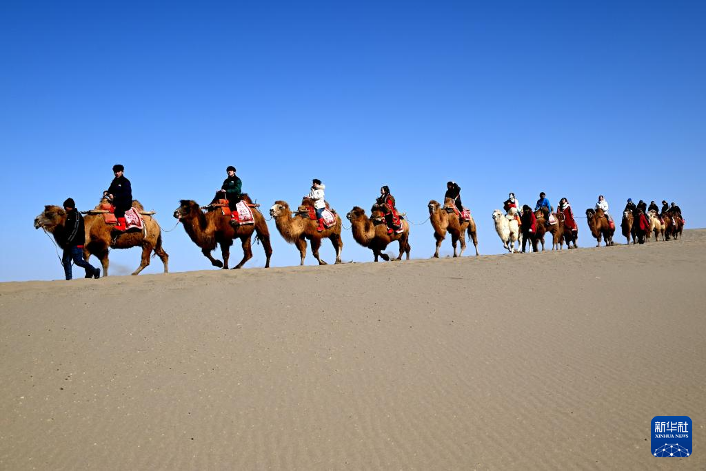 2月23日,游客在甘肃省敦煌市鸣沙山月牙泉景区游览。