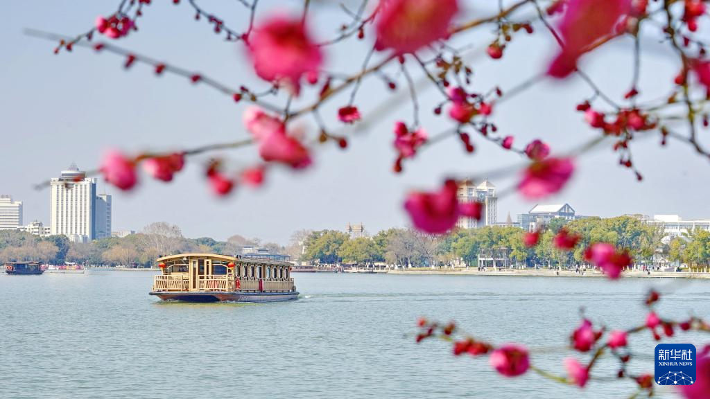 2月24日,一艘船从浙江省嘉兴市南湖风景区湖面驶过,与绽放的梅花相映成景。