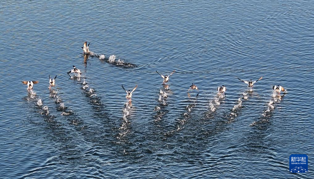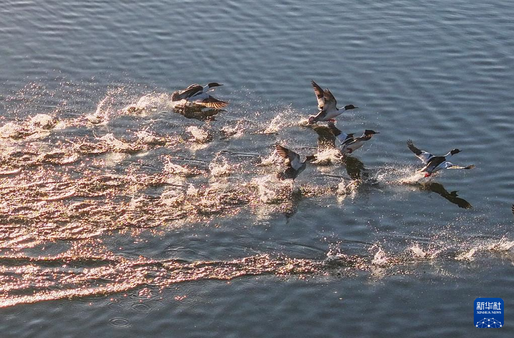 这是2月24日在河北遵化龙门湖拍摄的水鸟(无人机照片)。